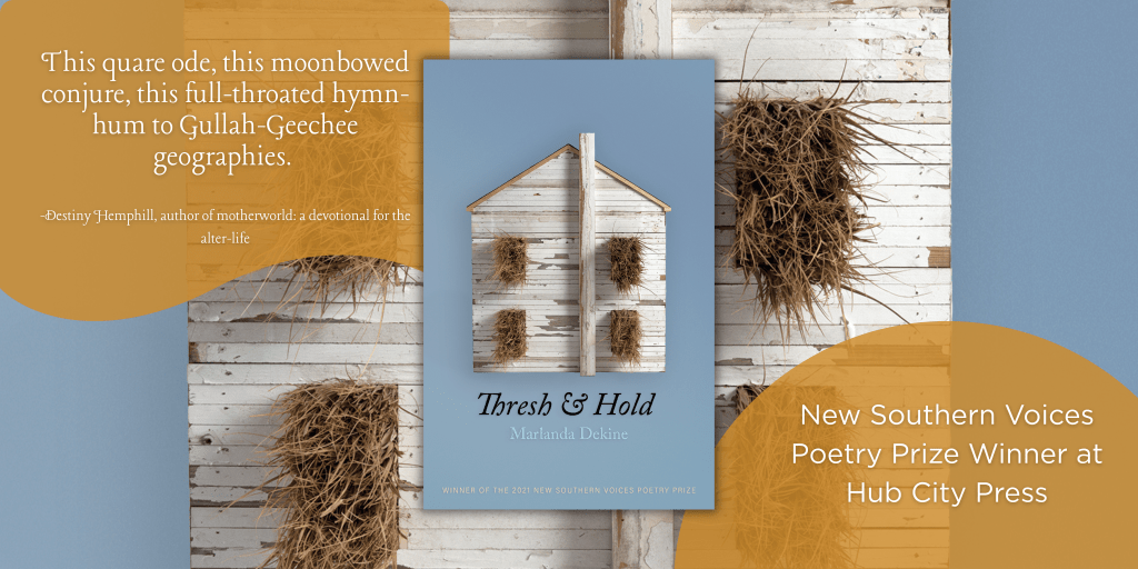 I cannot and will not put Marlanda Dekine’s, Thresh & Hold down. The world it builds, celebrates, and reclaims is a reckoning and a symphony. From the brutality of the rice plantations of South Carolina to the specific privacy found inside one’s Saturn Vue, the breadth of human experience that unfold in these poems cover histories that, we too often forget, are all intimate stories. Dekine reminds us that every moment we read about is a moment some body has fought or celebrated or been unable to live through. The effect of this is that we are brought into the vast music of a world that is endlessly unfolding, It’s fairly common to read poems that speak about community but there are only a handful of poets alive; Nikky Finney, Destiny Hemphill, CA Conrad come to mind, whose poems truly make community as the work blooms before us. This is a poet of that order and ability. I am so blown away by the gift and the challenge of this book. A book that not for one moment looks away from the brutality and beauty of this world.”